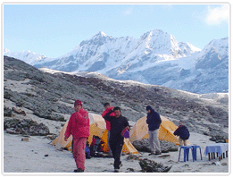 It is a gradual ascent all the way to the base camp. This is the Khangchendzonga Base Camp, which is also the site where the Himalayan Mountaineering Institute of Darjeeling conducts its advanced mountaineering courses. You can get close views of Frey's peak, Koktang, Kabur and Rathong from here. Return to Bikhbari. |